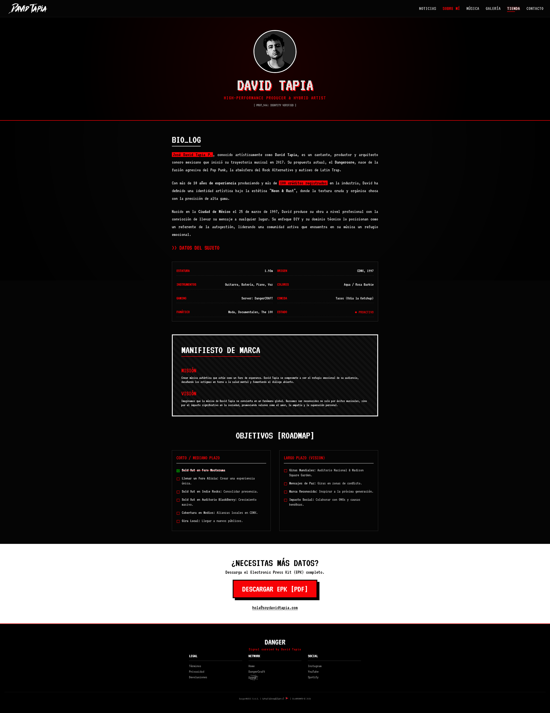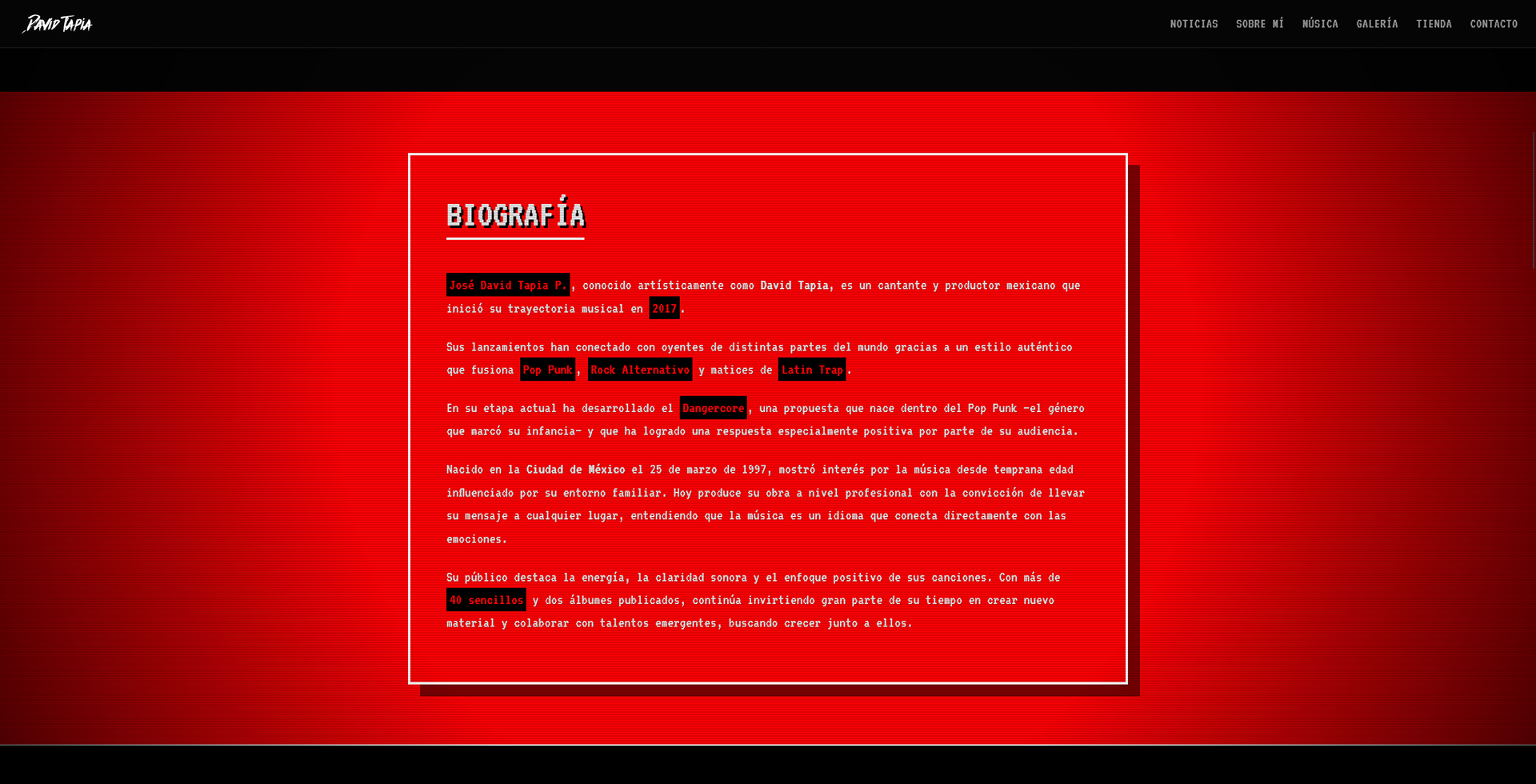 Discover the vibrant musical universe of José David Tapia P., better known as David Tapia. Since his debut in 2017, this Mexican singer and producer has captured the attention of a global audience with his unique and energetic approach to music. Specializing in Pop Punk, a genre he has loved since childhood, David has particularly resonated with his followers with his recent focus on this style. His music, a refreshing mix of Pop Punk, Dancehall, and Latin Trap, is characterized by its clean sound and positive messages. With over 10 singles to his name and a constant dedication to creating new music and collaborations with emerging talents, David Tapia continues to expand his impact on the global music scene. Join his journey and experience the passion that defines every note of his music.
